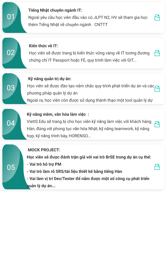 - Chương trình đào tạo thực chiến cao: Khóa học tập trung đào tạo nâng cao về ngôn ngữ tiếng Nhật chuyên ngành ITkỹ năng giao tiếp chuyên nghiệp trong dự án phần mềm do trực tiếp giảng viên người Nhật đứng lớp.